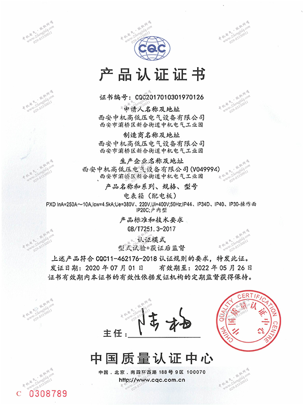 XM配電箱產品認證證書
